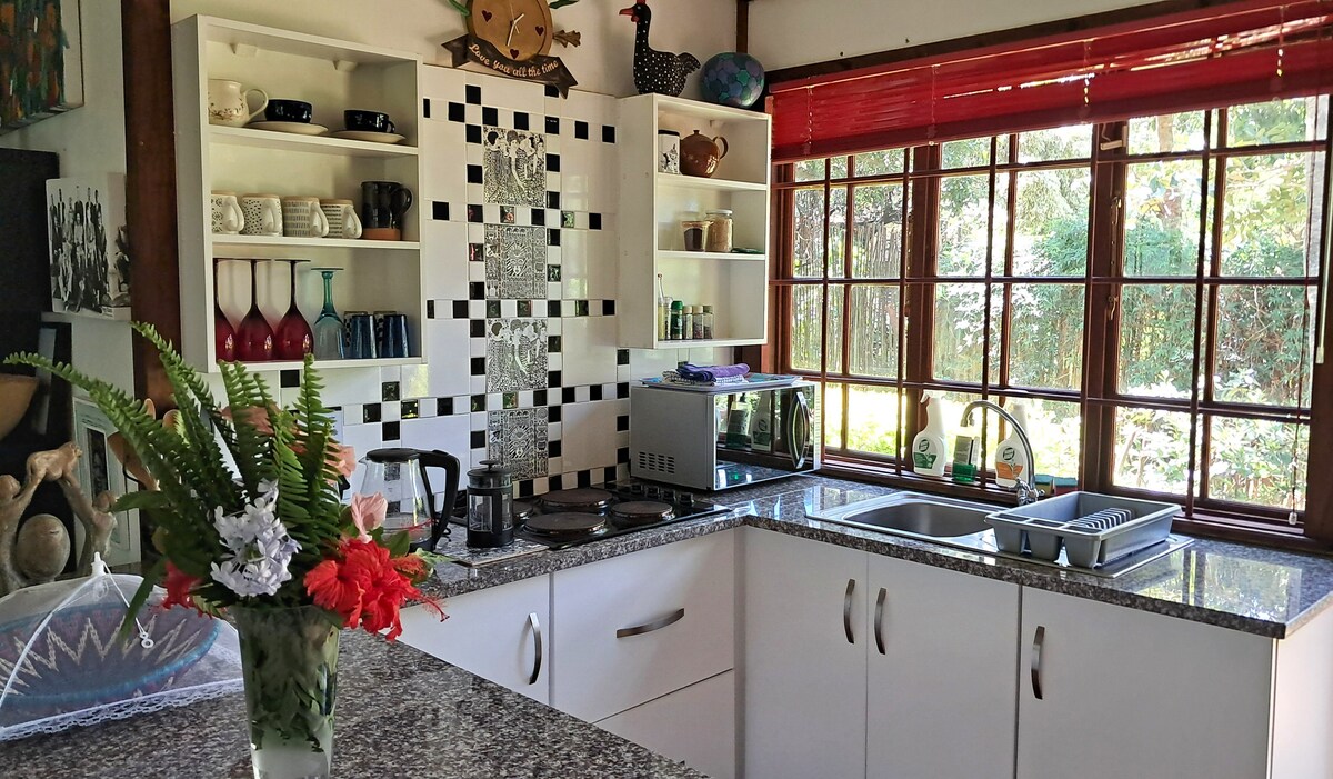 La nostra accogliente baita che può ospitare 4 persone si trova sotto gli alberi nel nostro bellissimo giardino di permacultura. Si trova a breve distanza in auto da centri commerciali, ristoranti, parchi giochi e sentieri escursionistici. Si trova accanto alla nostra galleria d'arte e alla casa principale, ma con un giardino sul retro in cui puoi rilassarti. Abbiamo anche una piscina! Amiamo gli animali e speriamo che lo facciate anche voi: ci sono molti gatti amichevoli e cani di grossa taglia, oltre a uccelli e scimmie! I bambini possono portare la propria maglietta e serigrafarla gratuitamente nel nostro laboratorio.