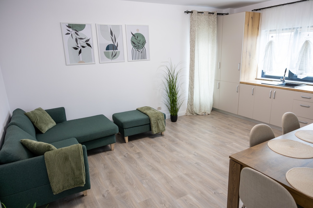 Rilassati in questa casa unica e tranquilla. Questo compatto appartamento di 42 m² offre uno spazio abitativo intimo con una disposizione ben progettata. Connessione Wi-Fi, TV da 139 pollici, sistema home cinema Netflix per l'intrattenimento durante il periodo di riposo. Perfetto per riposare, viaggi d'affari o romantiche vacanze in città a Bucovina. Il check-in può essere effettuato 24 ore su 24, 7 giorni su