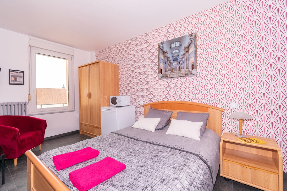 All'interno di una residenza privata, molto tranquilla e mantenuta con cura, F1 di 30 metri quadrati moderno al 3° ed ultimo piano, comodo, accogliente, vicino a una vasta area commerciale, può ospitare due viaggiatori. Situato a 10 minuti dalla Germania, tutti i comfort, 1 letto matrimoniale, wifi, TV, parcheggio privato, bagno con vasca/doccia, asciugacapelli, specchio ingranditore e lavatrice, cucina attrezzata con forno a microonde, forno, macchina per il caffè "senséo", tostapane, bollitore... 1 letto supplementare disponibile.