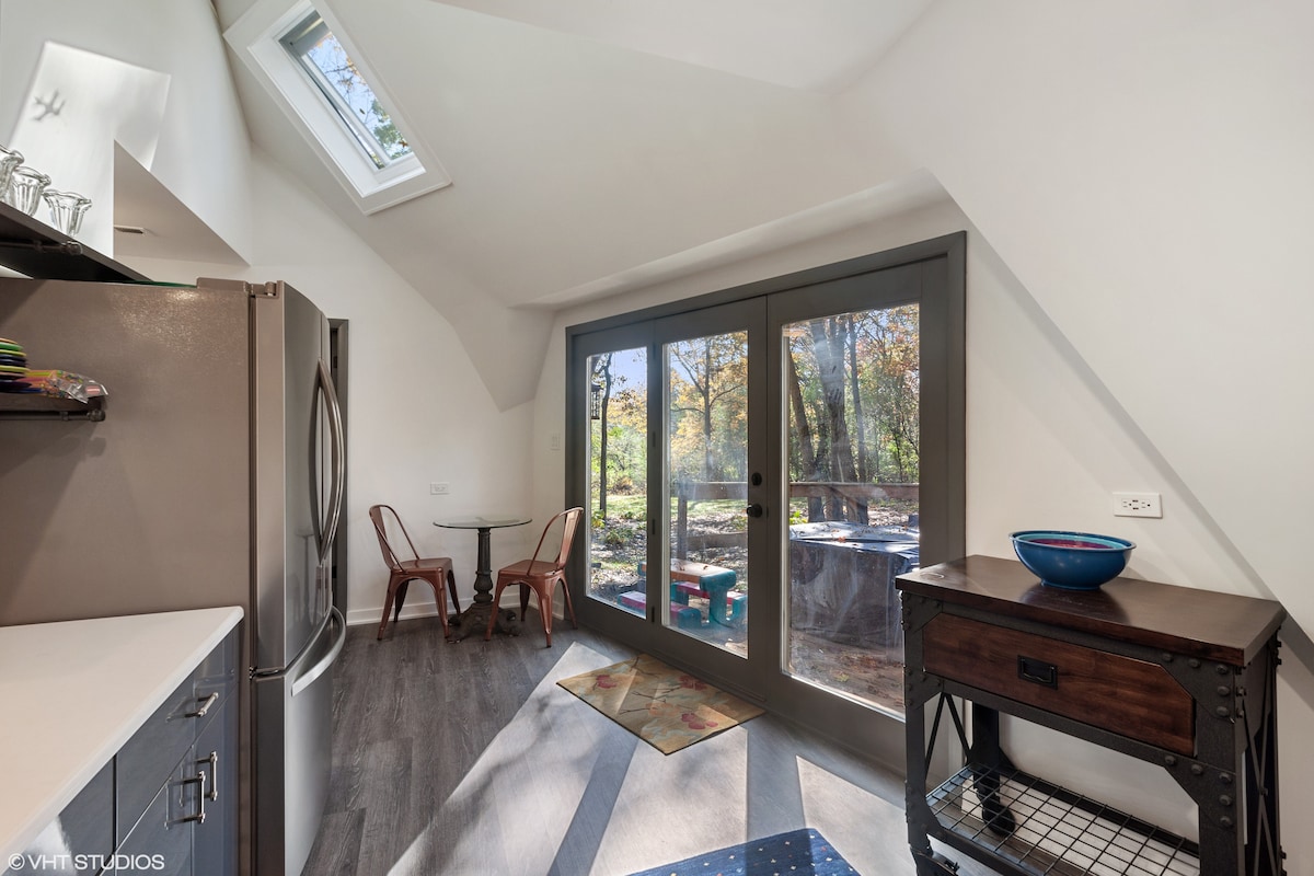 Affascinante alloggio vintage! Appartamento con garage Sears Craftsman Coach House del 1935. Bellissimo quartiere sicuro circondato da case storiche e a pochi passi dal sentiero della prateria dell'Illinois, parchi, birrerie/bar, ristoranti e altro ancora! Con un'atmosfera eclettica boho chic, dotato di cucina completa e lavatrice/asciugatrice privata in loco. Affacciato su un incantevole cortile accessibile! Vicino agli aeroporti e con facile accesso ai mezzi pubblici e alle principali autostrade. A soli 30 minuti dal Chicago Loop!
