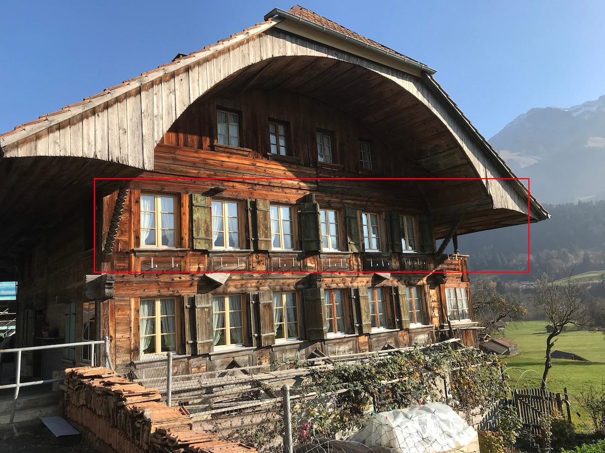 Appartement in einem schönen Simmentaler Haus mit sensationellem Blick ins Diemtigtal (Richtung Wiriehorn). Das Appartement verfügt über eine gut ausgestattete Küche, Bad mit Badewanne, Dusche und Waschmaschine. Eine gemütliche Stube lädt zum Entspannen ein, vom Schlafzimmerbett sieht man die Berge. Im zweiten Schlafzimmer können bis zu 3 Personen übernachten. Skigebiete Diemtigtal ca. 15 Minuten mit dem Auto. Wanderwege und Naturpark in der Nähe.