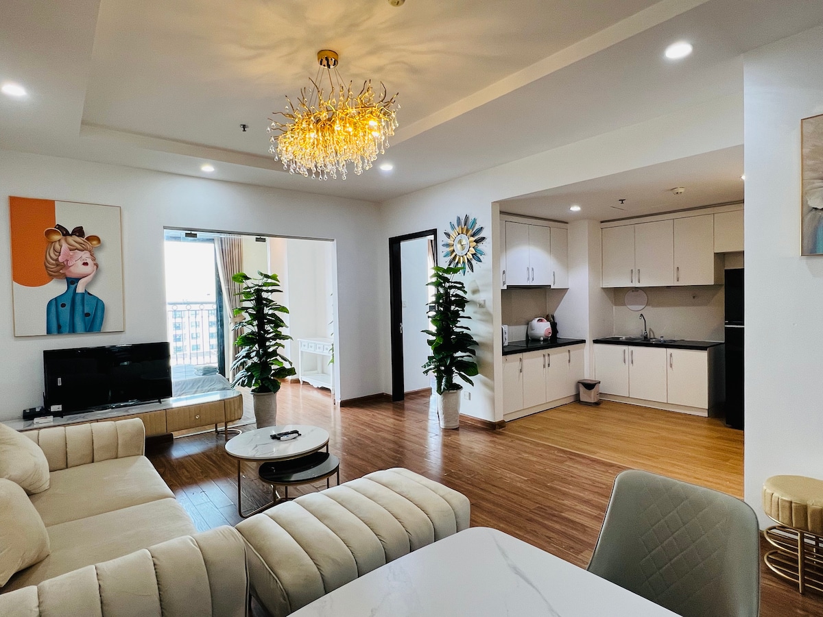 Un intero appartamento di 90 m ², 2 camere da letto completamente attrezzate (camera padronale di 18 m ² con un WC di 5 m ² + un tivi + un letto king-size + un grande guardaroba all'interno e 1 altra camera da letto di 10 m ²), 2 balconi, 1 soggiorno di 20 m ² con un divano di 3 m ², un tavolino da caffè, un tivi intelligente con wifi gratuito, 1 tavolo da pranzo, acqua calda, camere con aria condizionata. L'appartamento è vicino a molte strutture come banche, scuole primarie e superiori della Vinschool, centro Vincom, piscina, centro sportivo californiano, spa, negozi di unghie e massaggi