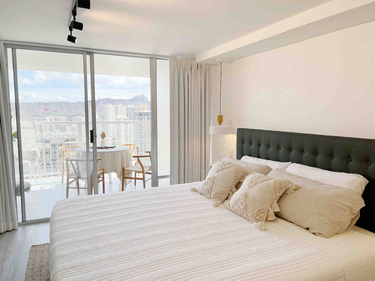 Svegliati su un letto matrimoniale grande e goditi la vista mozzafiato sull'oceano, sulla città e sulle montagne da questo rifugio al 35° piano! A pochi minuti da ristoranti, negozi, un canale e un parco, sarai al centro di tutto. In 10 minuti a piedi raggiungerai la spiaggia, dove potrai goderti una vista mozzafiato sul tramonto. Se sei in cerca di avventura, Diamond Head è a soli 10 minuti di auto e offre un'indimenticabile escursione sul vulcano. L'angolo cottura è perfetto per preparare pasti caldi, rendendo questo il luogo ideale per un soggiorno rilassante e indimenticabile.