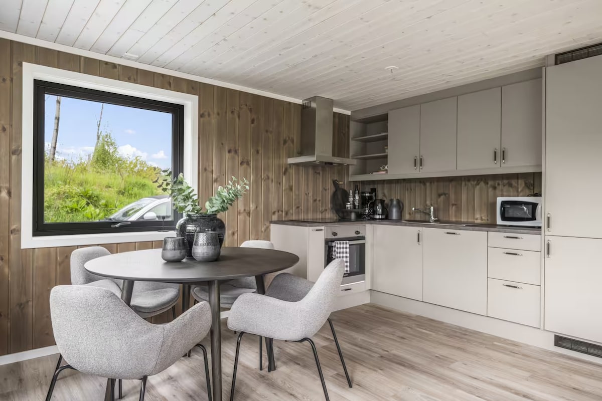 Cottage luminoso e moderno vicino al mare. Ampie finestre panoramiche con una vista fantastica. Cucina con lavastoviglie. Viene fornito con una piccola barca da pesca/barca a remi. Potete pescare o nuotare appena sotto la baita. Vasca idromassaggio a legna (l'uso deve essere organizzato, 350 NOK per 1 uso,poi 200 per riscaldamento) Il vassoio del SUP viene affittato 200 NOK per soggiorno per sup La baita si trova da sola su un naso alla fine del fiume nel fiordo surnadale. Check-in di solito dalle 15.00,ma spesso è possibile effettuare il check-in prima. A 20 minuti dal centro alpino di Sæterlia e dai sentieri di fondo