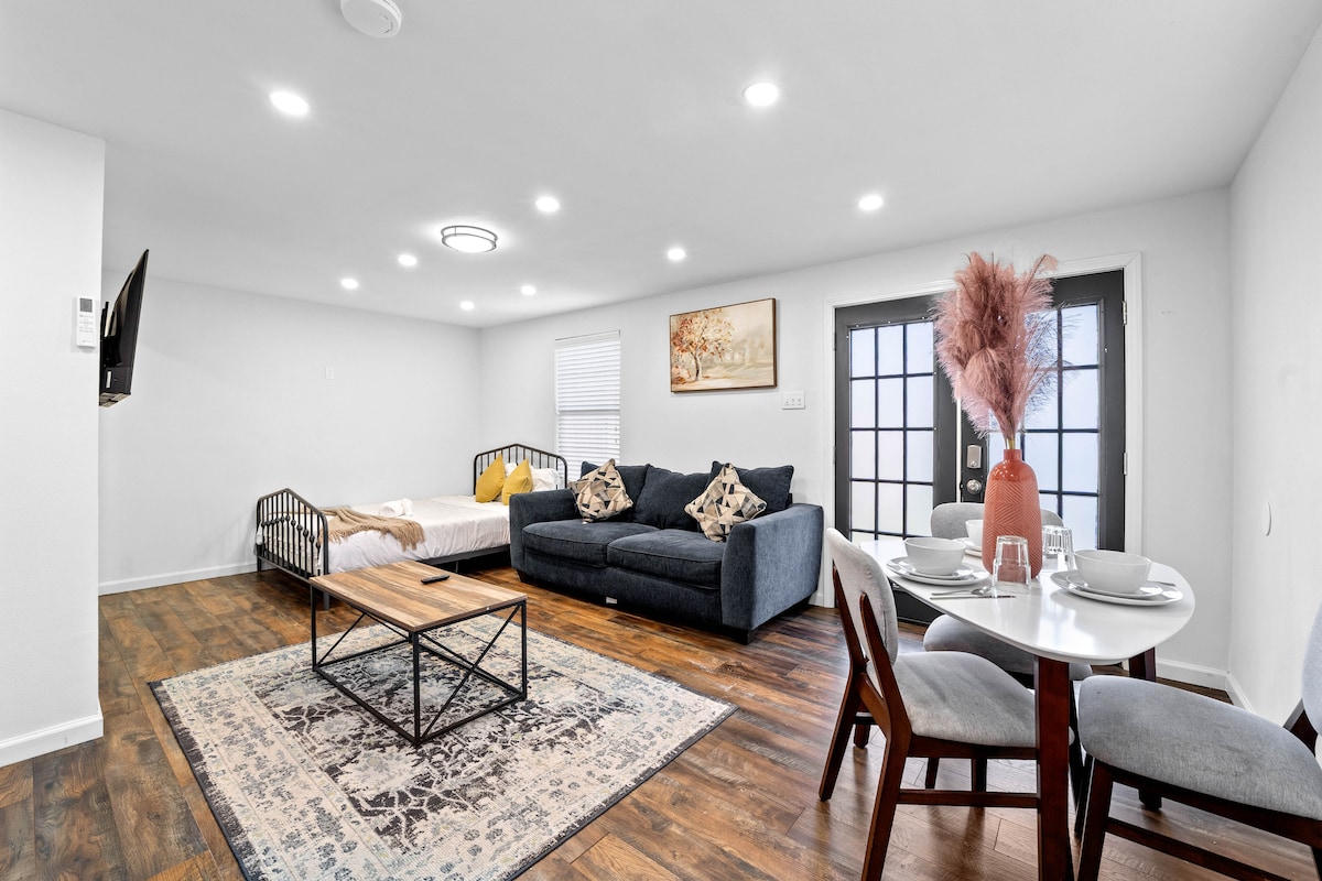 Soggiornando in questo spazio unico, ti sentirai a tuo agio. Una camera da letto con un morbido letto matrimoniale e anche un divano letto matrimoniale per il tuo ospite in più. Completo di wifi gratuito, Netflix gratuito e aria condizionata centralizzata con telecomando per ogni stanza. Doccia completa con panca integrata. Dotato di lavatrice e asciugatrice impilabili a grandezza naturale. Elettrodomestici in acciaio inossidabile e arredamento di buon gusto. Ottima posizione a meno di 10 minuti dal centro medico e da altri punti di riferimento di Houston.
