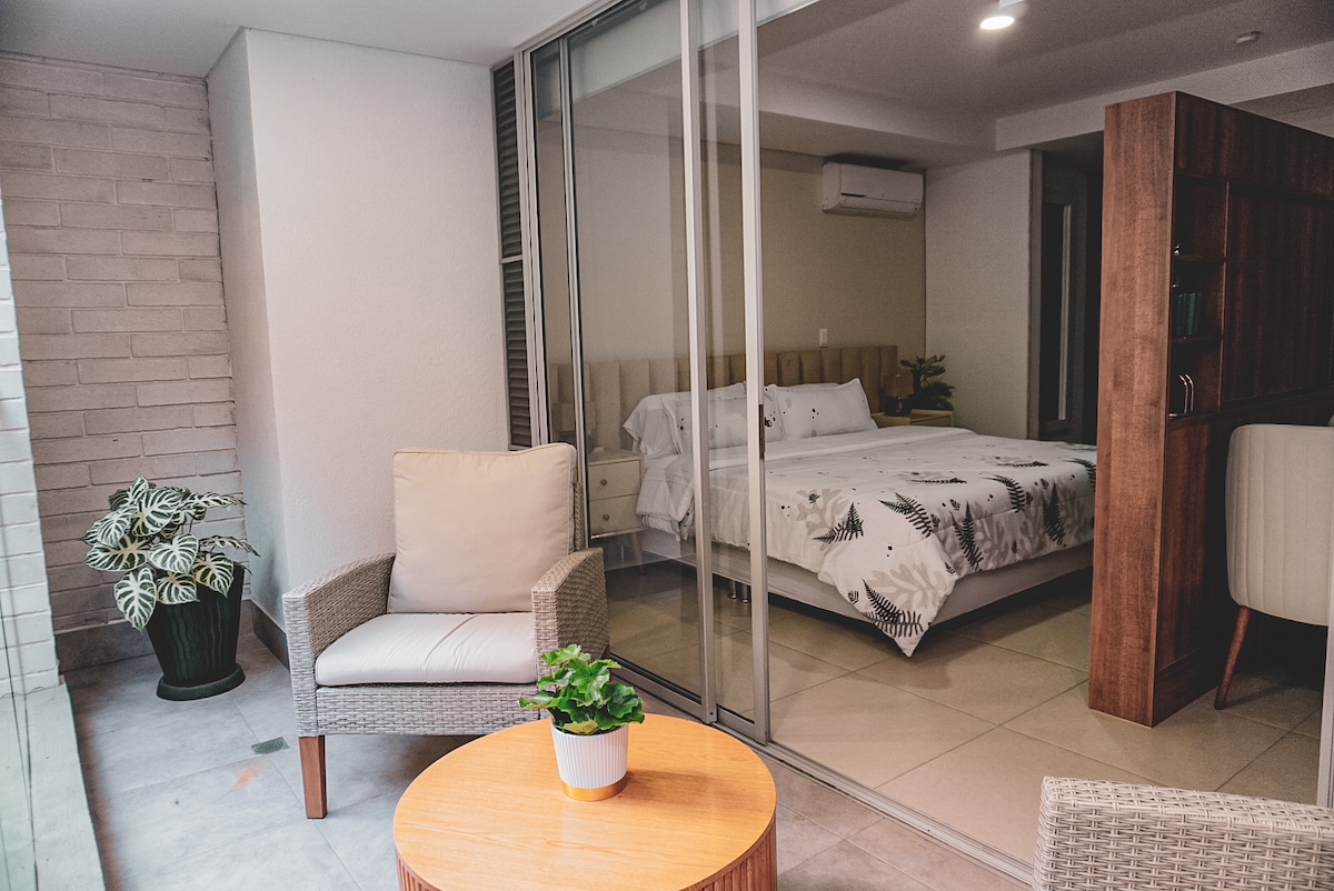 Monolocale attico di lusso nel vivace quartiere Granada di Cali con splendida vista sulla città. Ideale per chi viaggia in solitaria, per coppie o per piccole famiglie. Può ospitare fino a 4 persone: letto matrimoniale e divano letto che si trasforma in un comodo letto matrimoniale. Nota: **Il costo totale della prenotazione varia in base al numero totale di ospiti** Goditi la cucina completa, la lavanderia interna, la terrazza e l'accesso a piscina, palestra, spa, coworking e sale riunioni. RNT: 251456