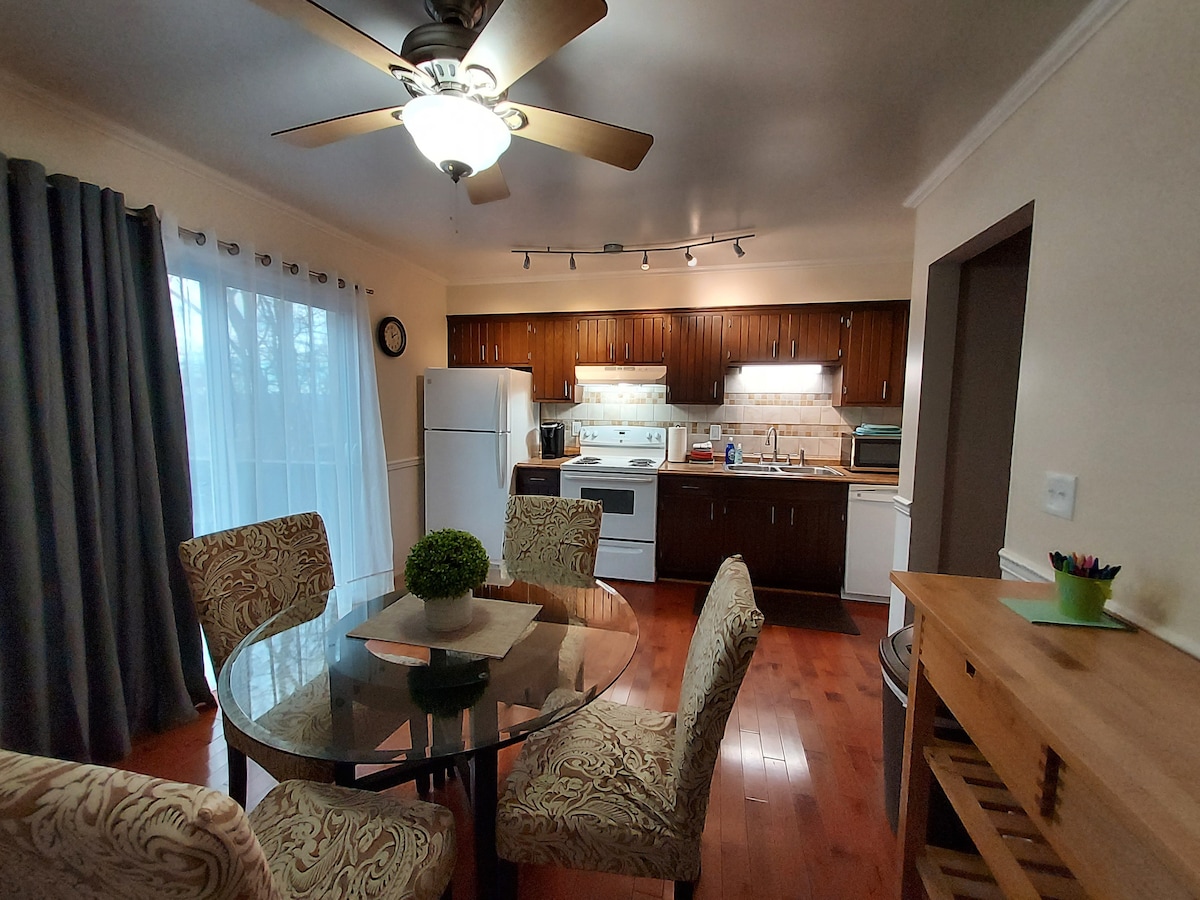 Our farmette's peaceful setting will surround you with green! This stylish, modern farm house apt. offers a full kitchen, dining area, and 65" flat screen tv. The bedroom has a queen size bed with sheets sun bleached white and smelling of fresh outdoor air. A nearby family room's leather sofa is ready to convert into a queen size bed. A generous bathroom is equipped with a tub/ shower.The private outdoor space is attached to a 1875 barn housing a small flock of chickens our guests seem to enjoy.