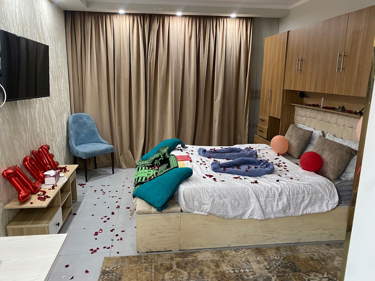 Design unico con piante vive, servizi semplici, camera da letto con spogliatoio, bagno esclusivo con doccia e vasca, ampio soggiorno con cucina a isola e dotato di elettrodomestici di marchi leader a livello mondiale. Un appartamento con connessione internet Wi-Fi 11 GB è inclusa nella prenotazione, SMART TV -65, una varietà di canali, completamente attrezzato per un soggiorno migliore. Stoviglie, elettrodomestici, tessuti. Spiaggia privata (profonda) e spiagge nelle vicinanze a partire da 20 sterline egiziane.