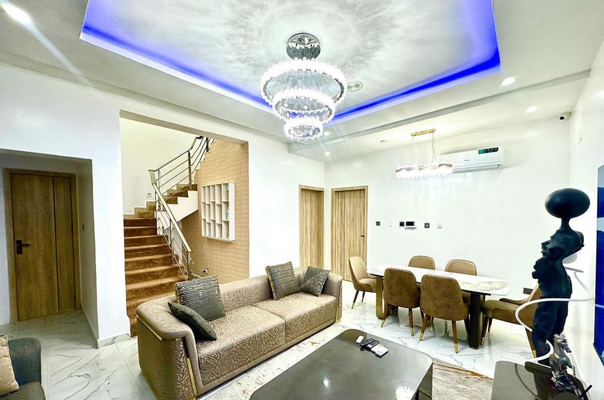 Welcome to this beautiful 4-bedroom terraced house in Lagos, perfect for families, groups, and business travelers. This fully furnished home has 4 large bedrooms, modern living room, equipped kitchen, and dining area. What makes it special: Solar Power (no NEPA worries) Quality furniture & appliances Fast WiFi Spacious compound with parking Washing machine, AC, fridge, microwave & essentials A calm, secure neighborhood, ideal for business or vacation stays. We look forward to hosting you!
