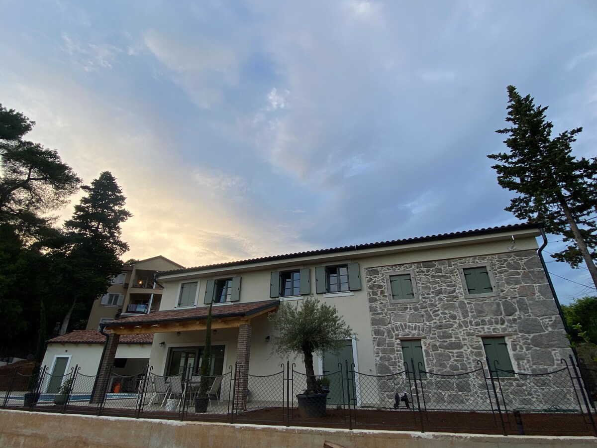 L'appartamento si trova vicino al centro di Abbazia, a pochi minuti di auto o a otto minuti a piedi. Si compone di un soggiorno, una camera da letto, una sala da pranzo, due bagni, una cucina, una sauna, un salotto open space, una terrazza, un giardino circostante e un parcheggio. Grazie al fatto di essere al piano terra con un giardino circostante si ha la sensazione di affittare una casa e non un appartamento.