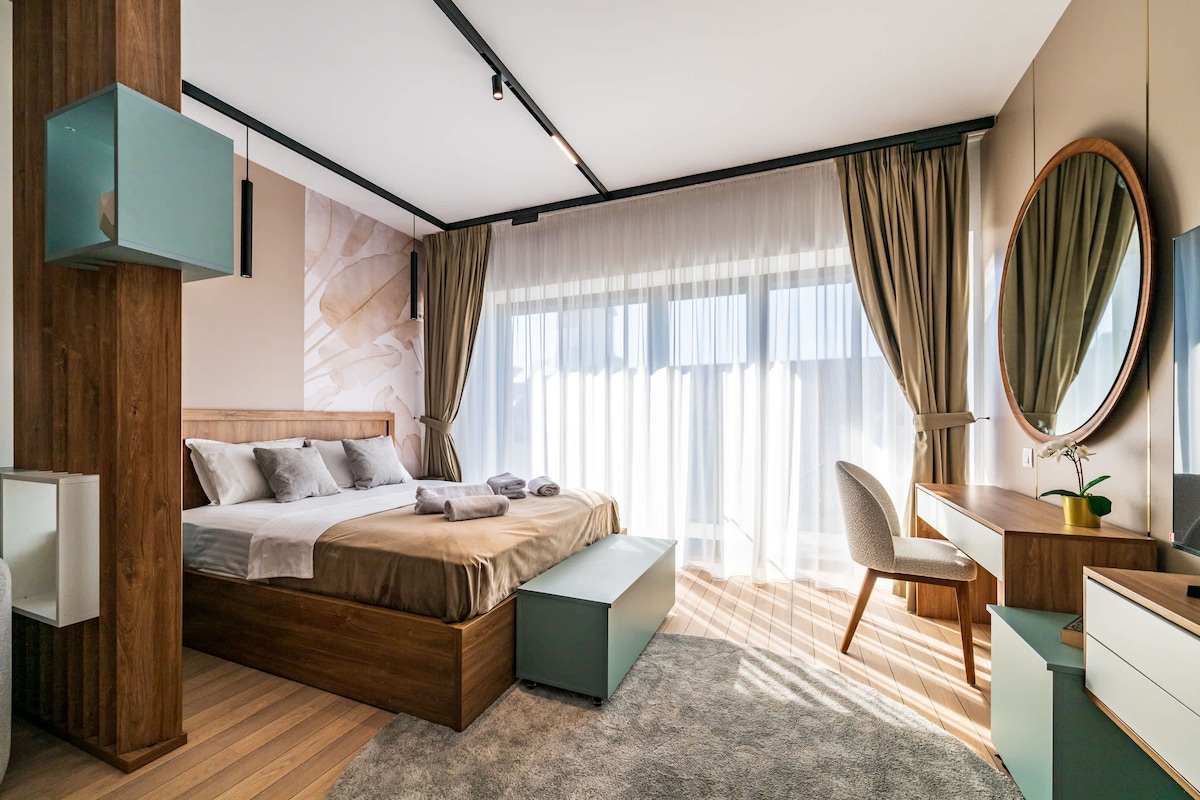 Goditi una calda JACUZZI in questo appartamento con 1 camera da letto e 1 bagno, situato in posizione ideale nel nord di Bucarest, a due passi dal centro affari. Dispone di tutto ciò che si può desiderare durante la visita. Oltre agli accoglienti interni, offre un'ampia terrazza privata da cui è possibile ammirare lo splendido tramonto che brilla direttamente attraverso le torri: ✔ Parcheggio privato sotterraneo gratuito ✔ Confortevole letto matrimoniale. ✔ Macchina da caffè Nespresso Wi-Fi ✔ ad alta velocità ✔ Balcone privato di 25 m²