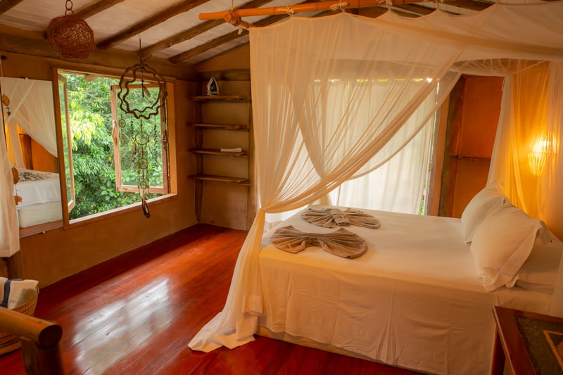 Un bungalow costruito artisticamente in ogni dettaglio...vasca da bagno aperta sulla foresta con soffitto in vetro trasmette la sensazione di essere immersi nella natura, con un albero di fico centenario di fronte e tanti uccelli…intimista e accogliente in connessione con la Natura a contatto con questa area di riserva della Foresta Atlantica. L'altra doccia calda si trova sul ponte aperto sul bosco ed è deliziosa di giorno o di notte con il cielo stellato e la luna.
