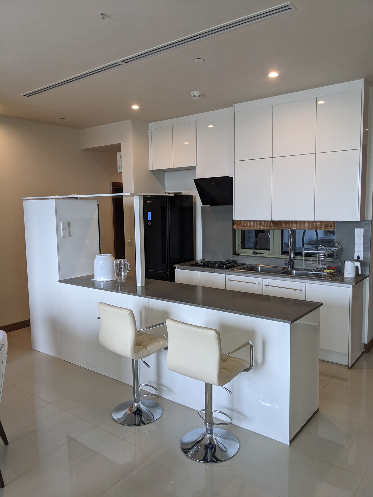 Nuovissimo appartamento di lusso al 28° piano della Luna Tower. Situato in posizione centrale, con un supermercato/centro commerciale dall'altra parte della strada. Vista sull'oceano e sul parco Viharamahadevi. Soffitti alti, pavimenti in teak, doppi vetri per bloccare calore e rumore ed elettrodomestici europei integrati. Mobili nuovi e moderni, cucina completamente attrezzata, tende termiche e così via. Servizi comuni: piscina a sfioro sul tetto, piscina per bambini, palestra, sale riunioni, sale funzionali, TVCC 24 ore su 24, 7 giorni su 7 e personale di sicurezza. Cerca Luna Tower per ulteriori dettagli.