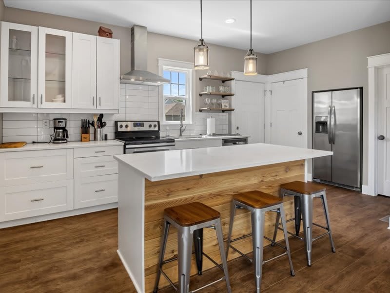 Historic One bedroom, Two Full Bathroom Cottage with sleeping arrangements for four people in the Chatham Arch Neighborhood just steps away from St. Joseph 's Public House and Brewery and a couple blocks away from Mass Ave. Quartiere. Travi e lampadari in legno originali proiettano la storia associata allo spazio abitativo accompagnati da un moderno aggiornamento della cucina e della zona pranzo. 613 E. North St ha un ingresso privato e un parcheggio con un grande portico anteriore per mangiare.