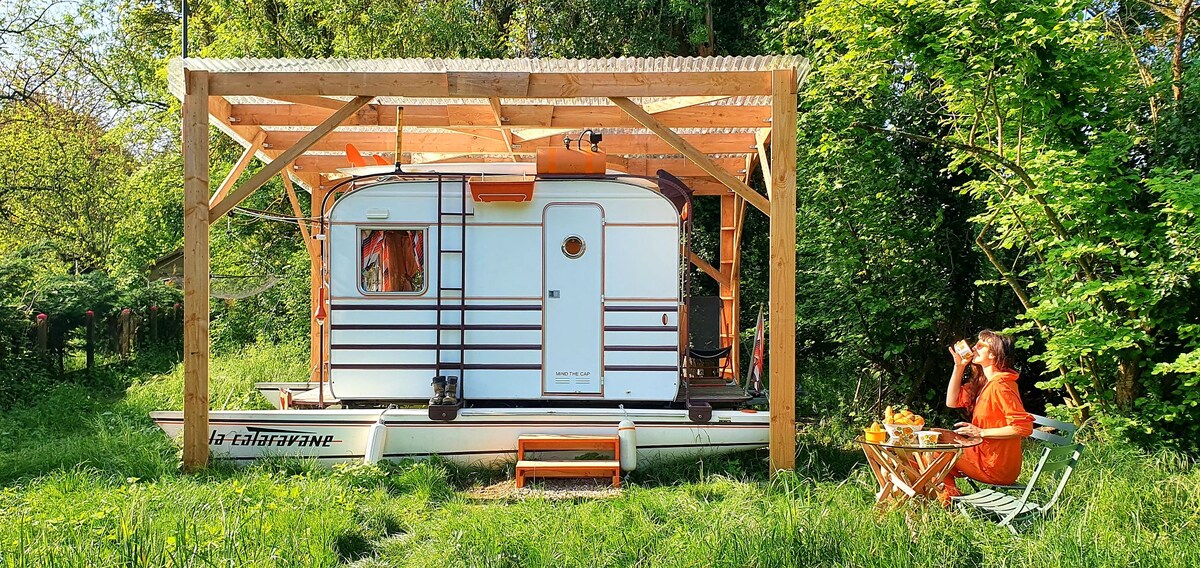 Mi catamaran mi caravane, la CATARAVANE vous accueille au coeur du jardin sauvage d'une résidence d artiste à la confluence de la Loire et du Cher. Un nid douillet 70's avec sa cuisine et sa baignoire pour 2 personnes extérieur et sa douche ext. (chaude) dans la "jungle" tourangelle. Atelier de réparations vélo à disposition. WC dans la résidence. ATTENTION en HIVER : caravane bien chauffé mais cuisine et douche exterieur/ possibilité de cuisine interieur et douche interieur si grosse pluie.