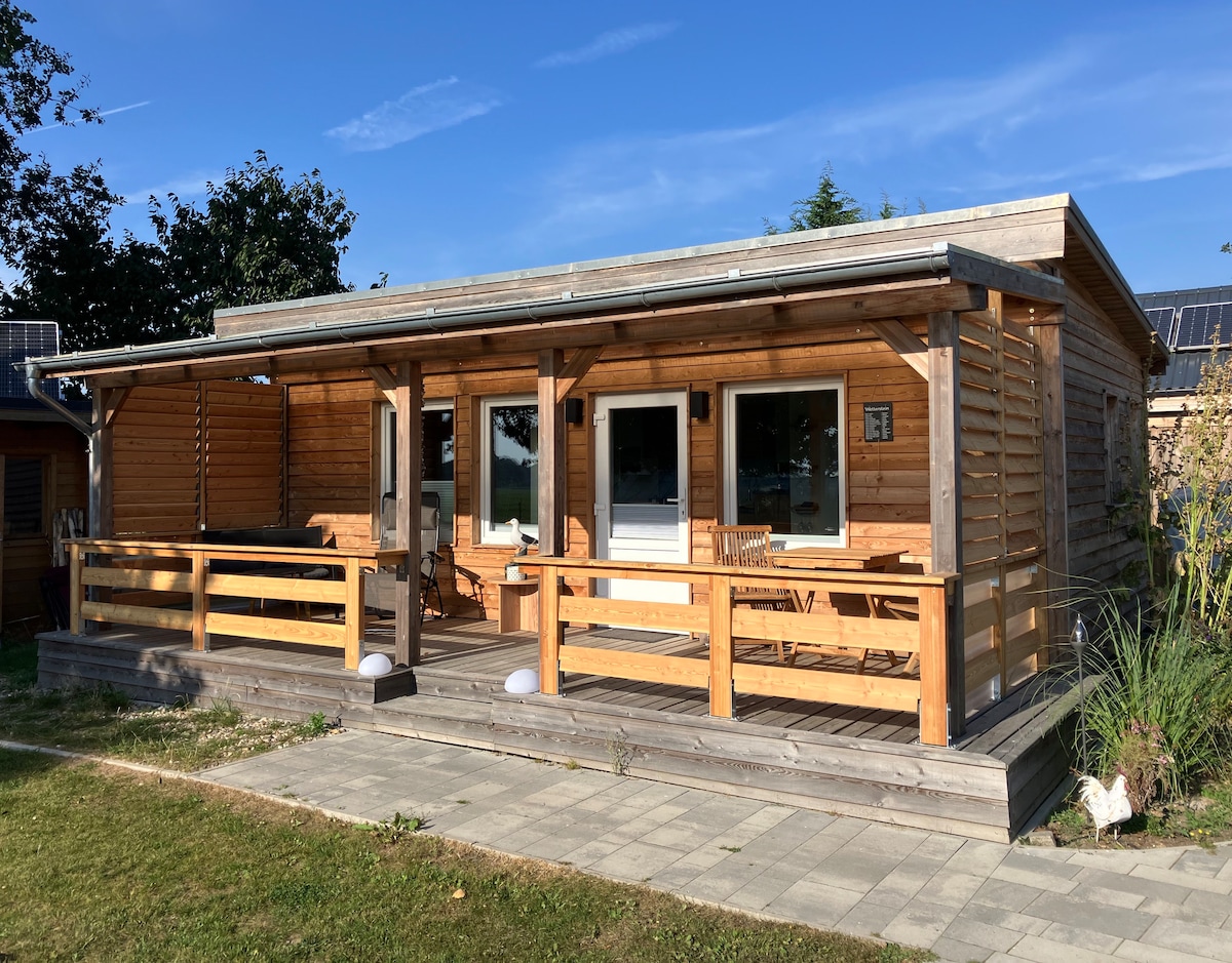 ... guarda l'acqua dal tuo letto, goditi la pace e la tranquillità e ascolta il fruscio del faggeto, prova i tour in bicicletta direttamente sull'acqua e goditi la natura. Ti aspetta una bella casa a graticcio moderna e rustica a basso consumo energetico, con tetto di paglia, piastrelle marocchine, assi del pavimento in rovere e pareti in argilla. Per le attività, c'è un bellissimo giardino con altalena nella foresta, sauna a vapore gratuita, doccia e vasca all'aperto, un SUP, un pedalò e 4 biciclette.