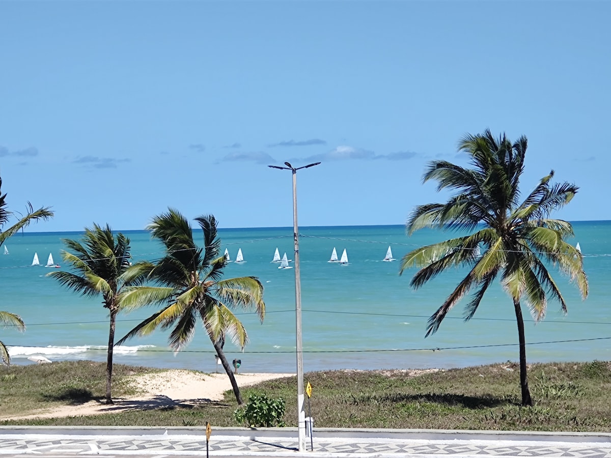Atenção: na noite do dia 31, réveillon, o palco da festa em frente ao residencial, caso se incomode com barulho, não reservar. Apartamento super bem localizado de frente ao mar, os dois quartos e a sala com vista para o mar. -Um quarto com cama de casal para 2 pessoas com ar condicionado; -Um quarto com duas camas de solteiro para 2 pessoas com ar condicionado; -O quinto hóspede dorme na sala no sofa. -Piscina na cobertura com uma incrível vista para o mar. - 2 banheiros; -Maquina de lavar.
