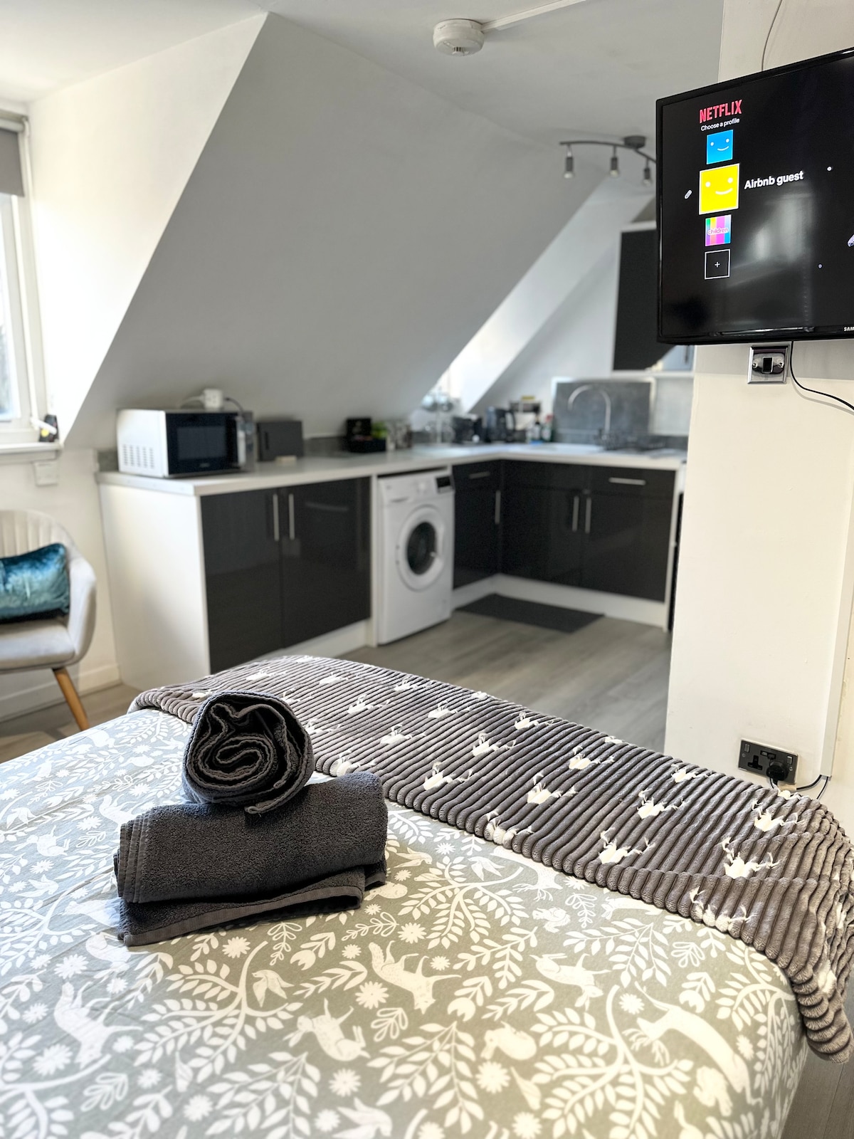 Fantastico appartamento con una camera da letto e caratteristiche di alto livello, nella zona Crown di Inverness. Parcheggio gratuito. Posizione perfetta per scoprire Inverness. A cinque minuti a piedi da tutti i ristoranti, bar e negozi di souvenir, nonché da una bella passeggiata lungo il fiume. A pochi passi dalle stazioni ferroviarie e degli autobus e a soli 20 minuti di taxi/auto dall'aeroporto. Tutti i comfort moderni: wifi gratuito, smart TV, asciugacapelli, asciugamani, articoli da bagno, kit di pronto soccorso e kit da cucito. Lavatrice, ferro e asse da stiro.