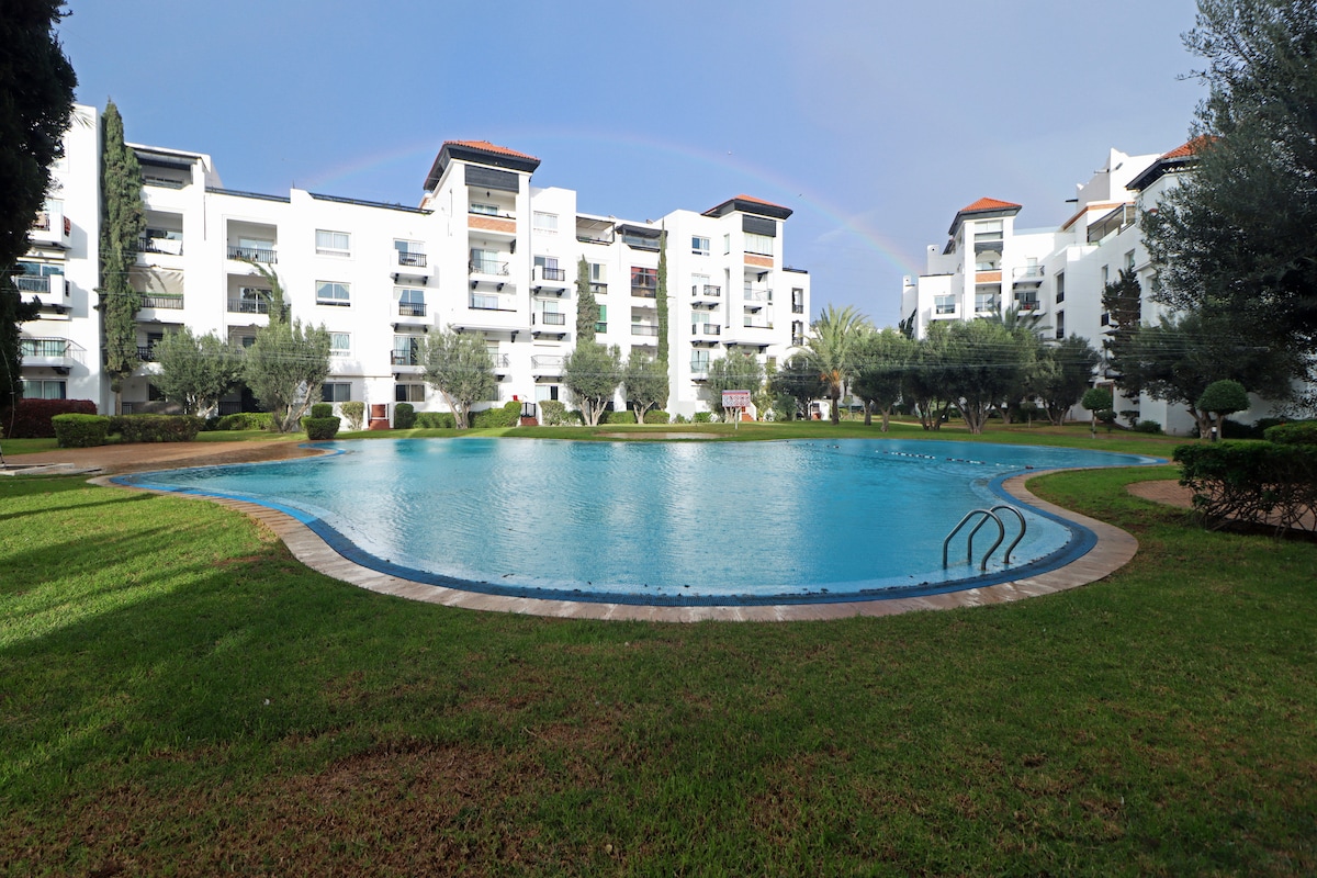 Puoi sederti e cenare nella nostra enorme terrazza o goderti una delle nostre numerose piscine o giardini. Questo appartamento si trova in una residenza super sicura e chiusa; si trova nella zona turistica imminente di Agadir, a soli dieci minuti dalla spiaggia e a meno di 5 minuti da coffeeshop, negozi, hotel... Nel residence si accede gratuitamente al parcheggio privato e custodito. Nell'appartamento c'è un enorme spazio abitativo con cucina a vista, un costume da genitore e un'altra stanza con due letti singoli.