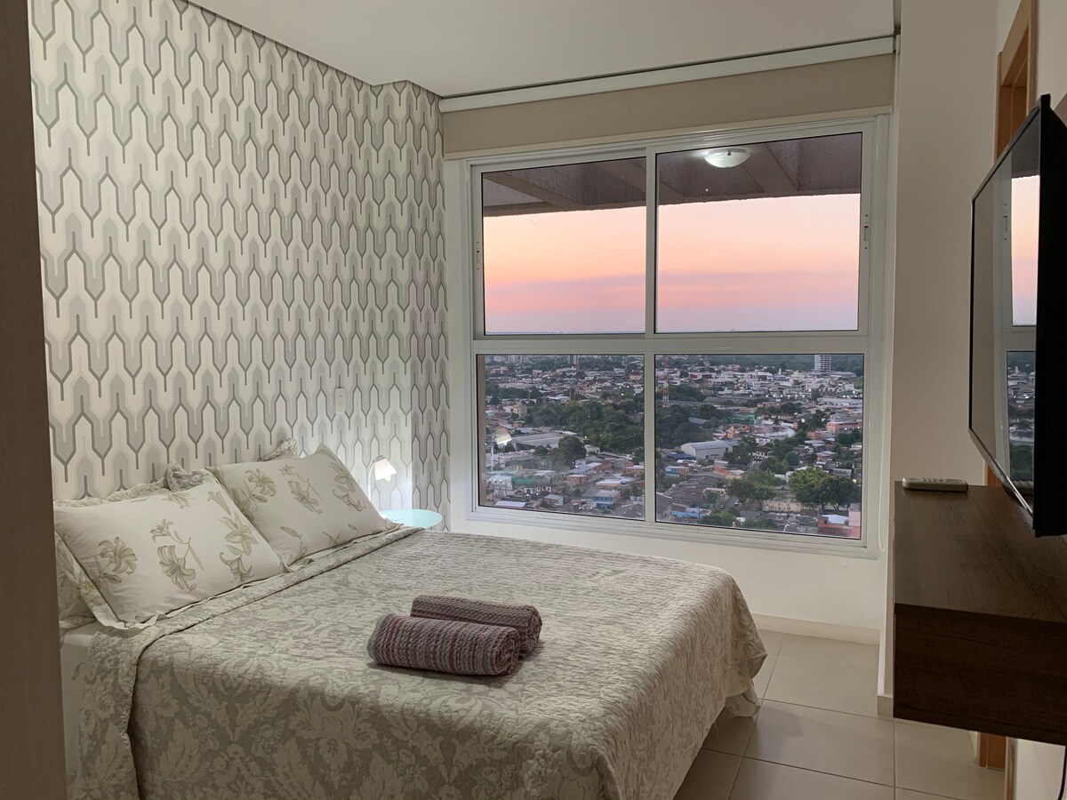 Accogliente attico duplex con una vista stupenda su Manaus. L'appartamento è nuovo e completamente attrezzato: abbiamo lenzuola, asciugamani, asciugamani, sapone liquido, sapone liquido, frigorifero, piano cottura, lavatrice, ferro da stiro e WIFI. Oltre a un balcone con barbecue con il piede giusto in alto per godersi il tramonto. Le 3 camere da letto con aria condizionata sono al piano superiore. Al piano inferiore si trova la cucina, il balcone e un soggiorno con aria condizionata e un divano letto. Vieni a sentirti a casa tua.