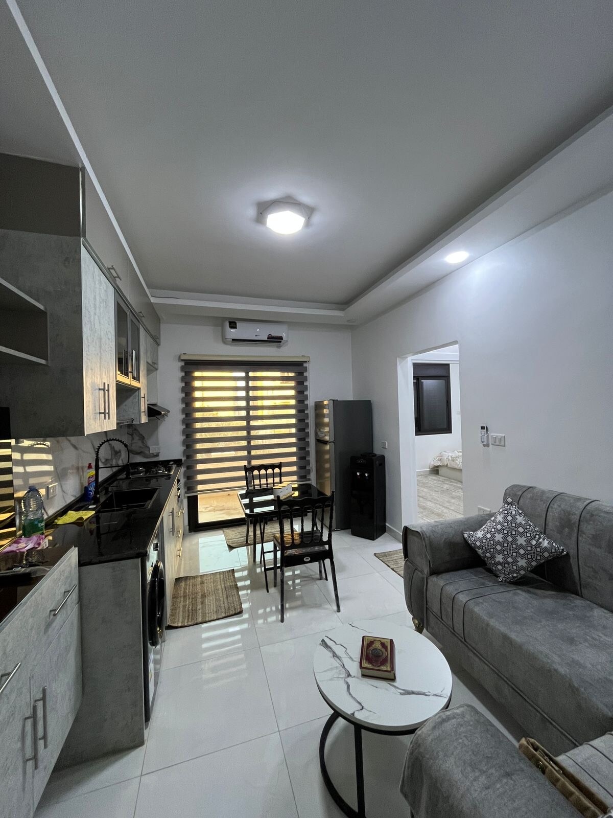 Il monolocale è completamente arredato a nuovo e ristrutturato con uno stile moderno che ti fa sentire come a casa tua. La posizione è la migliore di Irbid, a 2 minuti dal cancello nord delle università Yarmouke, ed è circondata da tutto ciò di cui potresti aver bisogno, da ristoranti a caffè e barbieri, biblioteche, ecc.
