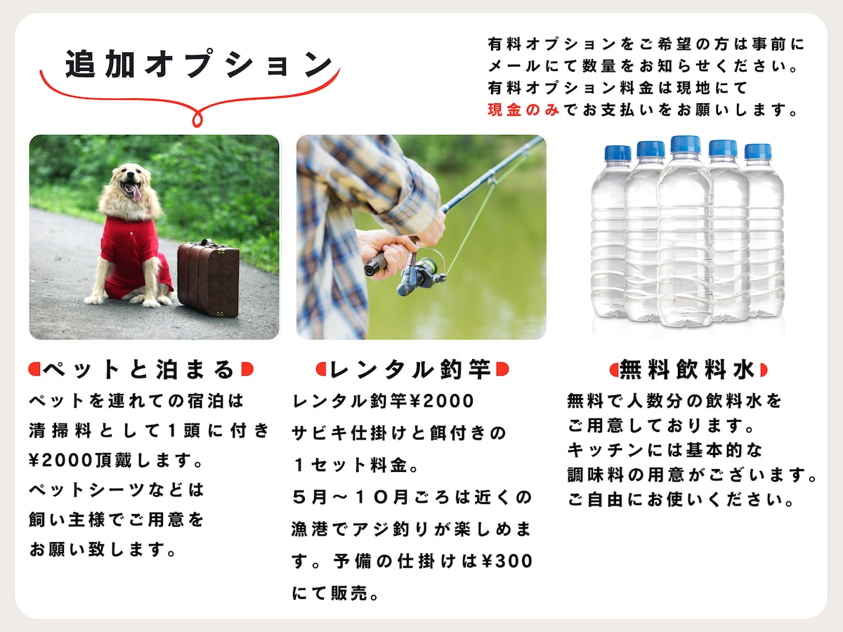 〖こんなグループにおすすめ〗 ・サウナ&BBQ好きのカップル・ご夫婦 ・3世代旅行や友人グループなど、最大8名までのファミリー・仲間旅 ・愛犬と一緒に「海辺でおこもりステイ」をしたいペット連れ旅行 【おすすめのポイント】 ①サウナ×BBQ/囲炉裏×海辺の貸別荘体験 プライベートサウナで心も体もリラックス。さらに囲炉裏のある空間で、昔懐かしい非日常のひとときをお楽しみいただけます。 ②ペットOK!愛犬との特別な思い出に 事前申請制で小型犬の宿泊も可能。専用ルールを守って、愛犬と海辺のひとときをお楽しみください。 ③自然とつながる立地 宿の周囲は静かな海辺。天気が良い日は満天の星空、朝は波の音で目覚める贅沢な時間。喧騒から離れ、心を整える旅にぴったり。 金沢と能登のちょうど中程に佇む、貸切一棟宿「海の宿mare」。一日一組限定なので、ご家族・ご友人・カップル、サーファー仲間同士で、プライベートな時間をお楽しみいただけます。 忙しい日常から離れ、癒しと非日常の別荘にお越しください。 皆さまのご利用を心よりお待ちしております。