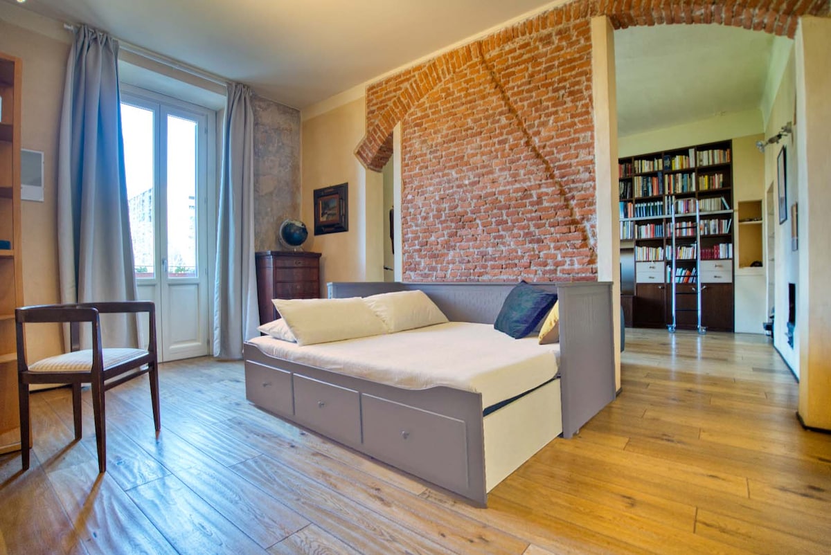 Affascinante loft situato in uno dei più belli e vivaci quartieri di Milano. L'appartamento è a piano terra all'interno del cortile di un piccolo condominio in una via tranquilla e silenziosa. Adatto ad ospitare fino a 4 persone in ambiente unico su due piani con soppalco. Al piano d'ingresso oltre alla cucina completamente attrezzata e al bagno con doccia è presente un divano letto matrimoniale. Nel soppalco si trova oltre al letto matrimoniale una postazione di lavoro.