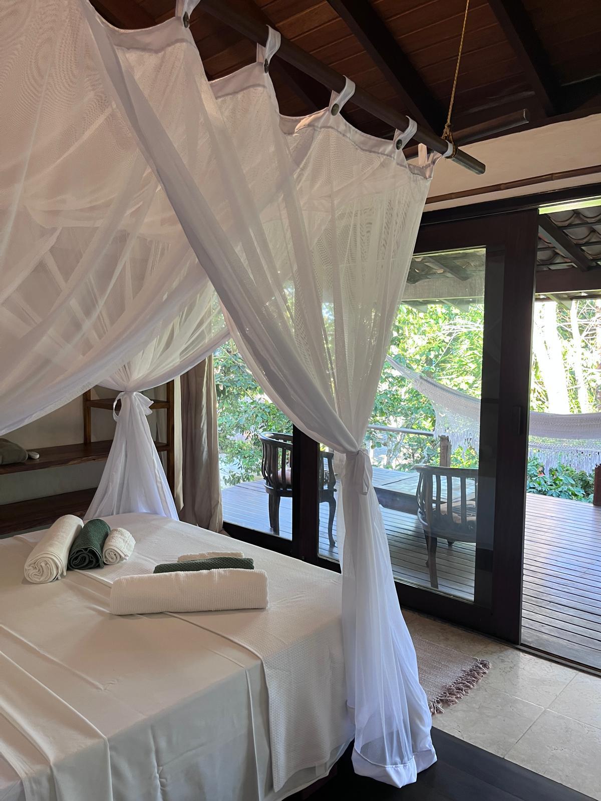🌿 Un modo conveniente per vivere l'esperienza Canto Leela, in un rifugio sul mare immerso nella Foresta Atlantica, ideale per chi cerca riposo e semplicità a contatto con la natura. 🌳 COSA RENDE UNICO QUESTO BUNGALOW Un bungalow rialzato in mezzo alla foresta, con vista sul manto arboreo: questa sistemazione offre comfort e tranquillità. Alloggio con aria condizionata ❄️, composto da: • Camera da letto con bagno privato, letto queen size e zanzariera • 1 terrazza anteriore con amaca • 1 veranda sul retro