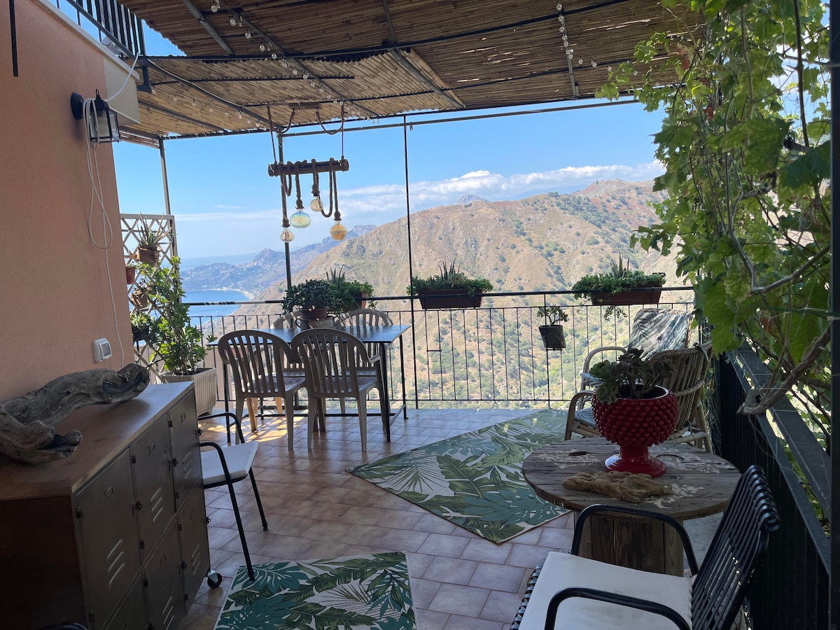 Incantevole bivano a Taormina centro con ampia terrazza e vista mozzafiato. Una lunga scalinata conduce alla struttura. L'appartamento,totalmente indipendente, climatizzato e con Wi-Fi gratuito,si trova a 250mt da Porta Messina, a 40mt dal Terminal bus, a 200 mt. dalla Funivia che porta direttamente al mare e a due passi dalle piu' importanti opere storiche del centro cittadino. La zona è ben servita da tutto ciò che occorre per un ottimo soggiorno: minimarket,bar, ristoranti, edicola...