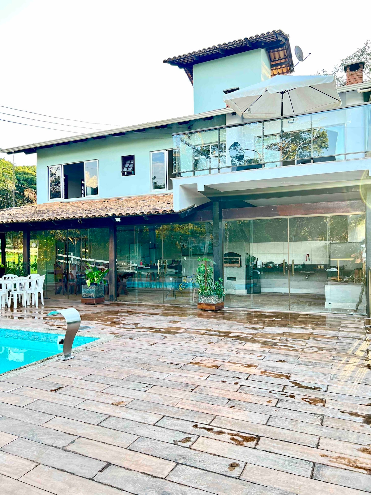 Porta tutta la famiglia in questo fantastico posto con tanto spazio per divertirti. Qui tu e la tua famiglia avete il comfort di una splendida piscina riscaldata con cascata e illuminazione , due tv con cielo, internet con wifi, barbecue, stufa a legna, bagni riscaldati a energia solare, vasca idromassaggio, ampie camere da letto, 2 sale da pranzo interne ed esterne, cucina interna completa, balcone con amache, enorme giardino tutto prato, vista sulle montagne e vista sulla laguna e sul campo