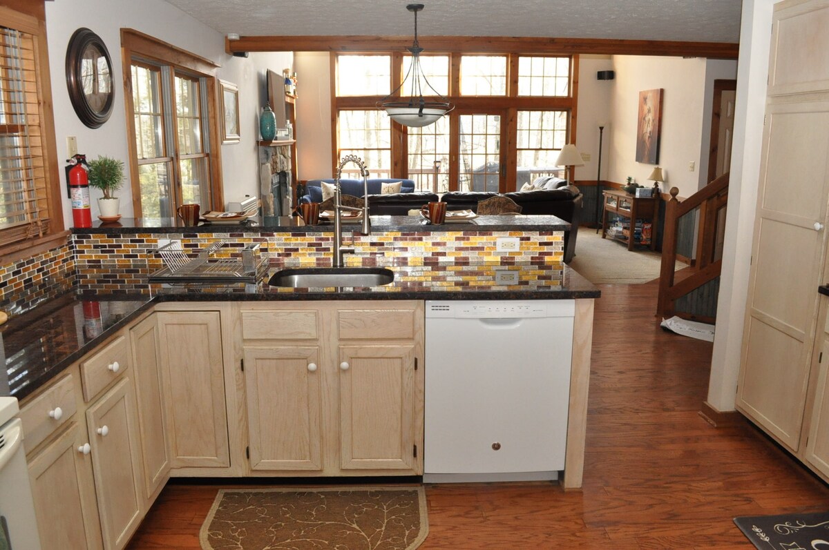 Una delle poche case che vanta un'enorme parete di finestre che si aprono sulla vista del Camelback Mountain e sulla natura circostante. La casa è leggermente arretrata, per garantire una maggiore privacy. Questa casa di montagna dispone di 3 suite padronali con bagno completo in ogni camera da letto. Abbastanza accogliente per le coppie, ma abbastanza spaziosa per famiglie e amici. Vista sulle montagne invernali da ogni stanza della casa. Cucina ben fornita e barbecue a gas sulla terrazza. A pochi minuti da tutto ciò per cui verresti sui monti Pocono.