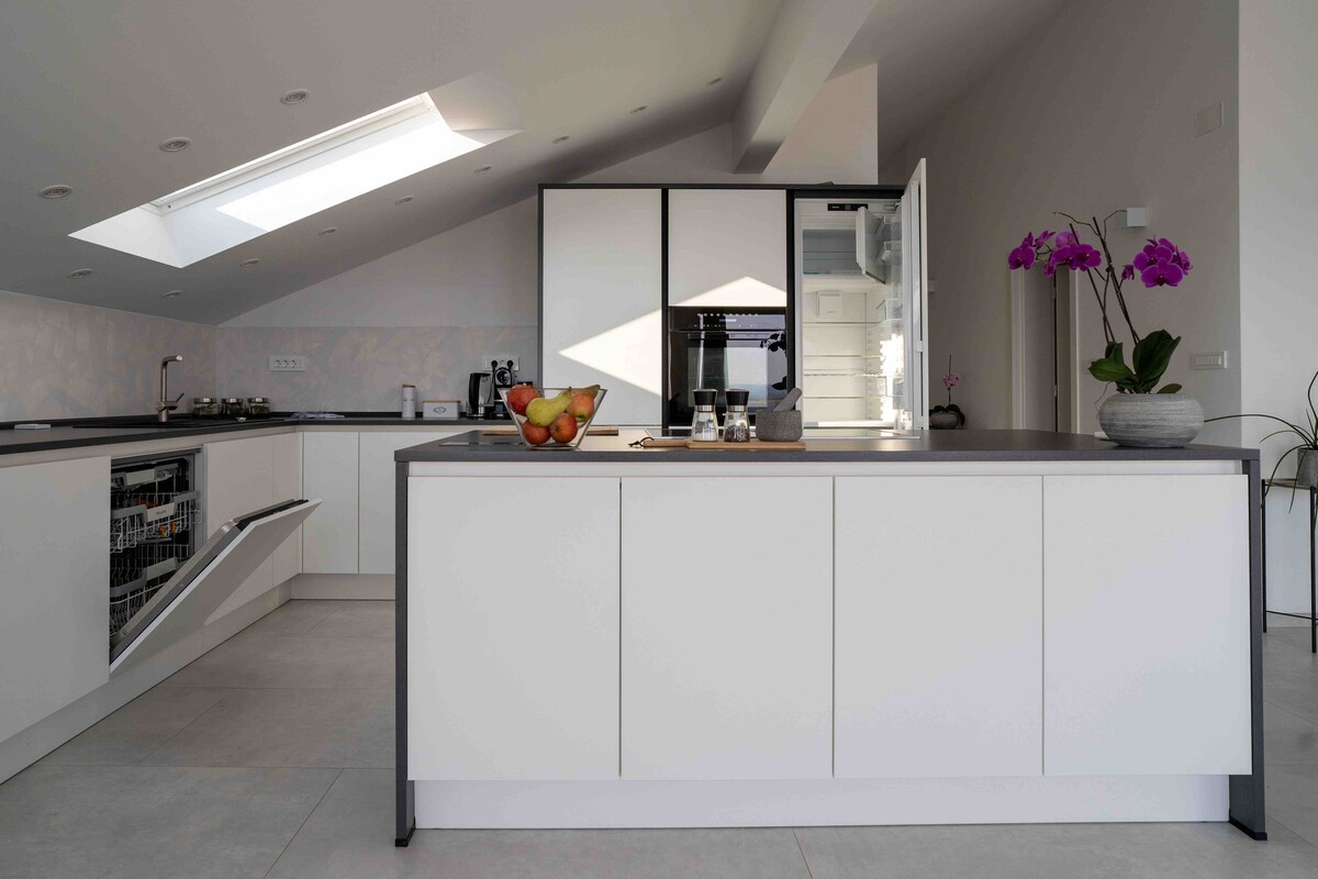 Questo alloggio speciale ha uno stile moderno e senza tempo. Un loft molto spazioso e luminoso con una vista sul mare unica. Arredamento contemporaneo e sofisticato, ideale per una vacanza rilassante e tranquilla. Godetevi il vino sul balcone al tramonto o preparate la colazione nella grande cucina. Divertimento e relax: questo è il motto. E non può mancare un po' di lusso.