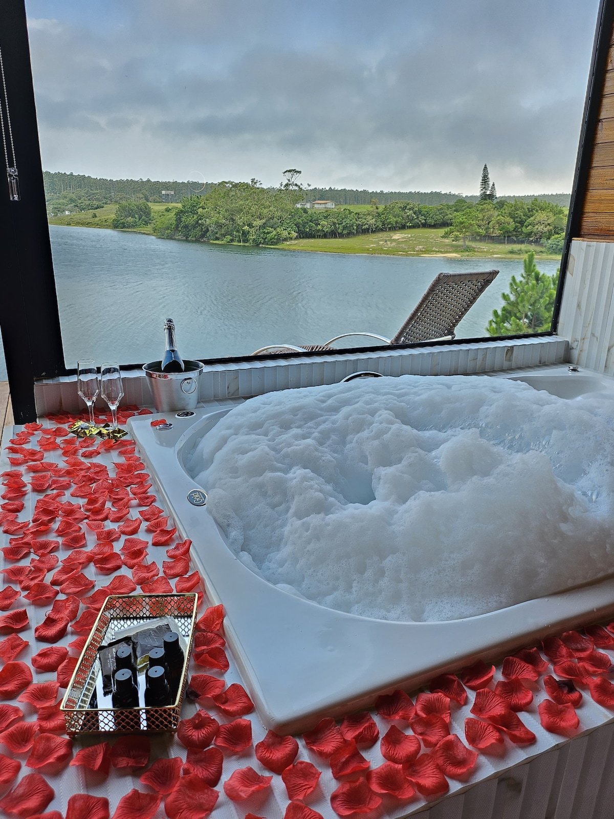 Questo luogo unico ha il suo stile. Chalé all'alba 🌄 Una vacanza per godersi momenti incredibili, vista privilegiata sulla Lagoa, super privata! @ChalesdalagoaJaguaruna Chalé Nascer do Sol 🌄 ✅ incluso nel soggiorno 🌹 Decorazione romantica 🍾champagne o vino 🛁Servizi per la vasca da bagno ☕capsolas per Dolce gusto E imita!