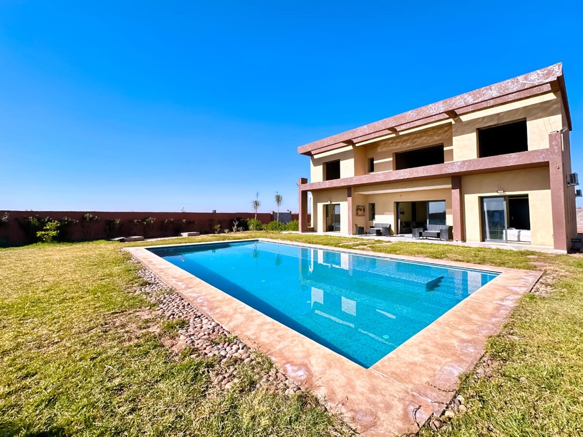 Situata a 18 km da Marrakech, questa villa senza dirimpettai offre un ambiente tranquillo, ideale per rilassarsi con la famiglia o gli amici. Dispone di 3 confortevoli suite, un ampio giardino paesaggistico e una splendida vista sull'Atlante. Godetevi una grande piscina di 13x6 m, con uno spazio sicuro per i bambini (2 m di larghezza, 40 cm di profondità) e una zona principale di 4 m di larghezza con 1,70 m di profondità. Villa privata al 100% Cuoca e donna delle pulizie su richiesta