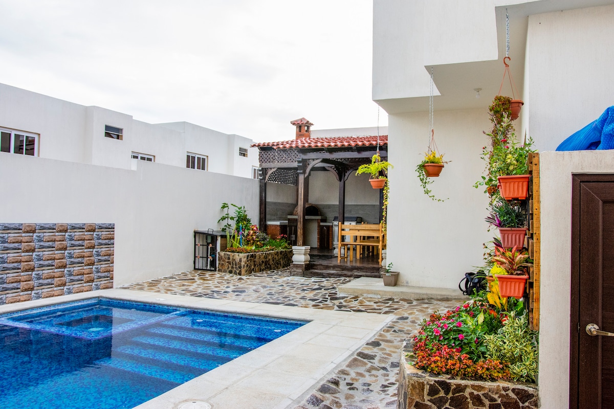 Vuelve a conectarte con tus seres queridos en este alojamiento ideal para compartir en familia o con tu pareja. Le brindamos el acceso a una hermosa casa espaciosa y cómoda con piscina privada (no compartida), al límite norte del municipio de Jalapa en Residencial Villa Hermosa. Contamos con amplio espacio para grupos grandes que buscan compartir en privado. Contamos con 3 habitaciones, área de cine y cocina comedor, piscina con calefacción, parrillada a gas, pérgola y sala de estar con cocina.