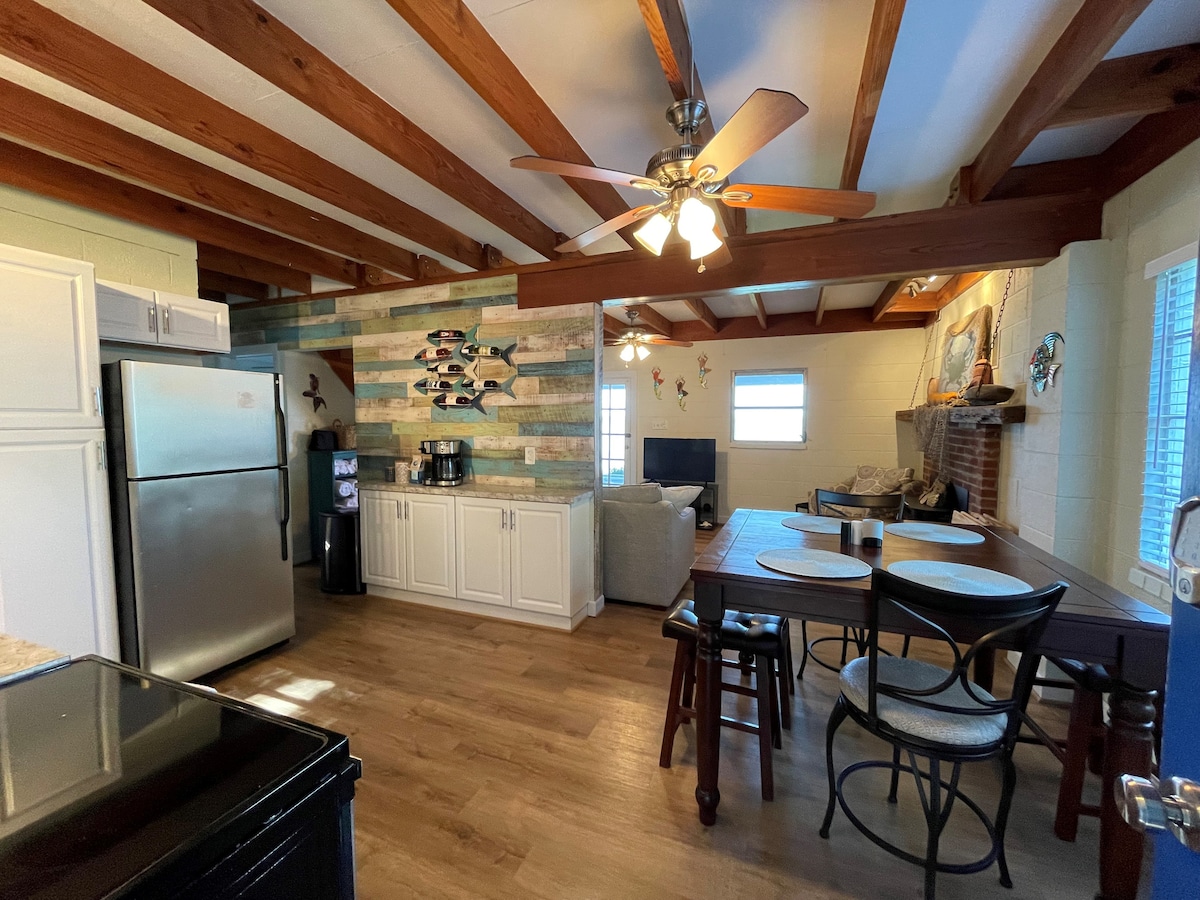 Your southern style spacious and bright cottage includes: -Sleeping area for 6 -Two full baths and a 1/2 bath in the main living area -Cable and WiFi -Two bedrooms each with a TV, full bath, closets, and dressers -Living Room area has a sofa bed, 1/2 bath, cable TV, electric fireplace, a ceiling fan -Kitchen with full fridge, dishwasher, microwave, coffee maker, blender, pots/pans, dishes, utensils -Laundry free in the unit -Front porch with rocking chairs -Shared gas grill and picnic tables