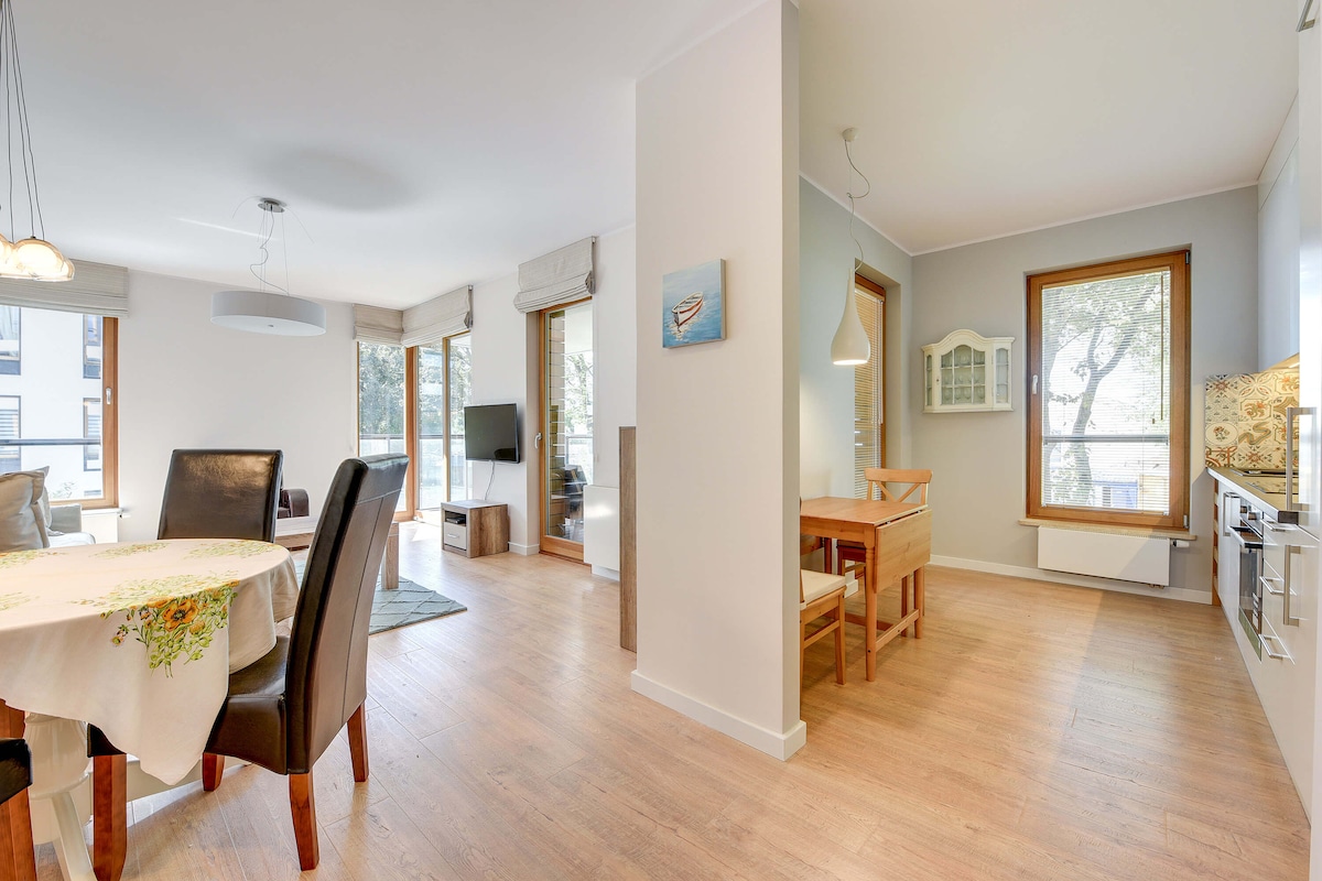 Appartamento di lusso situato a pochi passi dalla spiaggia sulla baia di Puck e dal molo di Mechelinki. È il luogo ideale per chi cerca una pausa immersa nella splendida natura e nello stesso tempo vicino alle attrazioni che l'Agglomeration Tri-City offre. Mechelinki offre alcuni dei paesaggi più spettacolari della costa polacca. A pochi passi, raggiungeremo le scogliere costiere che le dividono da Gdynia, il porto di pescatori o Rewa, una mecca per gli sport acquatici.