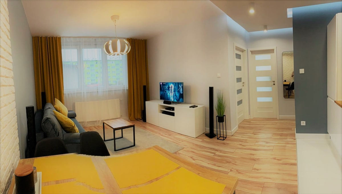 Zapraszamy Cię do naszego mieszkania. Znajdziesz w nim wygodne miejsce do spania dla 6 osób. Apartament składa się z 2 sypialni, w których są po dwa pojedyncze łóżka (dla Twojej wygody zadbaliśmy abyś mógł połączyć je w duże łóżka, sam zadecyduj czego potrzebujesz). W salonie znajduje się duża rozkładana dwuosobowa sofa i płaski TV. Mieszkanie ma w pełni wyposażoną kuchnię (zmywarka, ekspres, mikrofala, lodówka, piekarnik) oraz łazienkę z prysznicem i podgrzewaną podłogą.