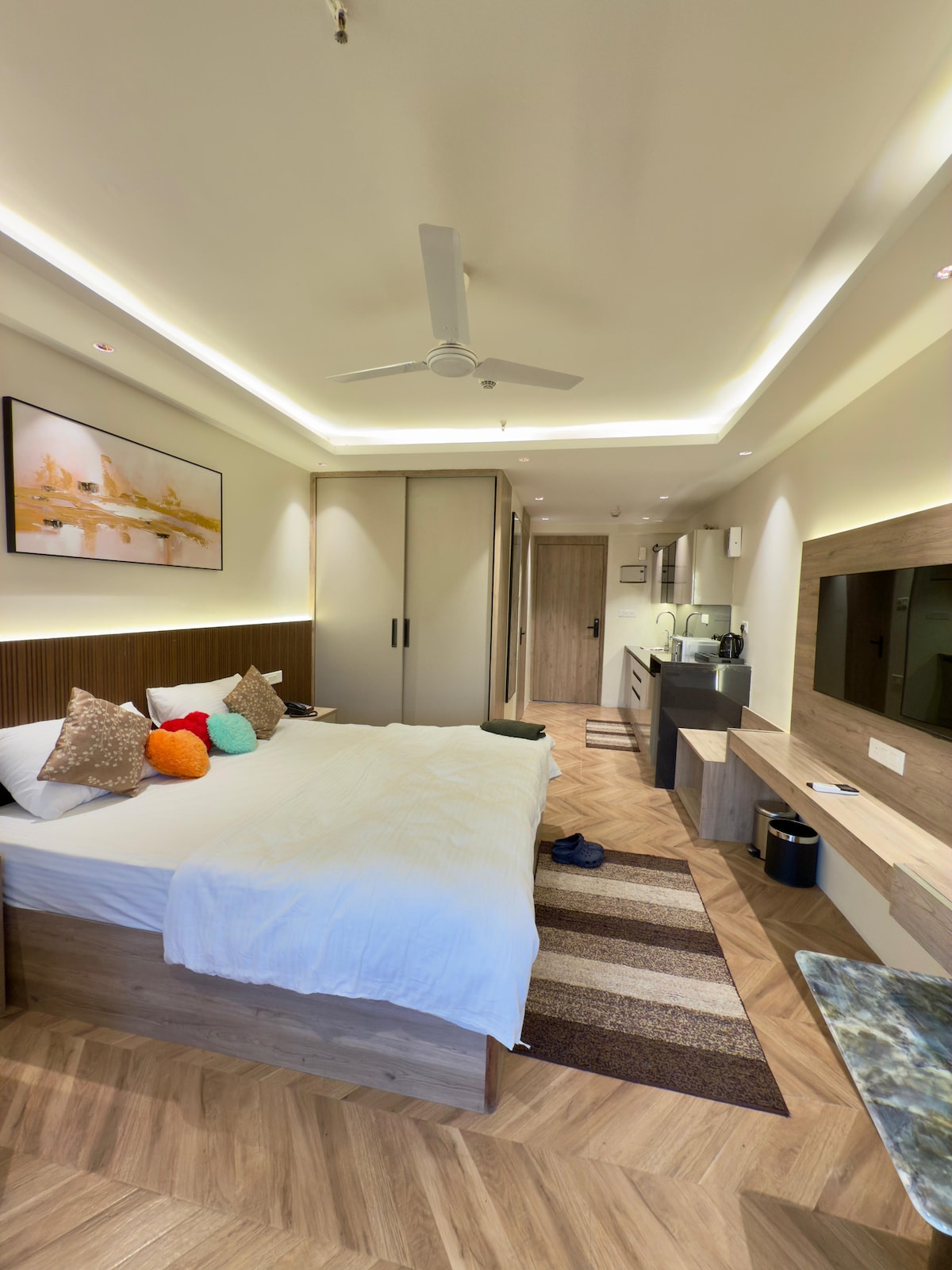 Fully furnished luxurious studio apartment with all modern amenities available in Greater Noida near Metro station. Luxurious , Specious and Couple friendly studio in Greater Noida Near Expo Mart. What You’ll Love: ✔ Unique Interior – Enjoy the Mesmerizing Interior. ✔ Modern Comfort – A beautifully furnished space with a comfy bed, cozy seating, and stylish decor. ✔ Fully Equipped Kitchen – Cook your favorite meals with ease. ✔ Fast WiFi & Smart TV – Stay connected and entertained.