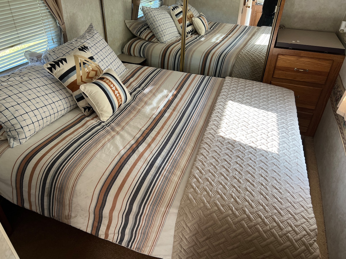 Soggiorna in questo posto unico e ricordalo per sempre. Abbiamo un ampio camper da viaggio di 11 metri con 1 camera da letto e 5 ruote che può ospitare fino a 6 persone. La camera da letto ha un comodo letto king-size, un comò, un armadio spazioso e una TV da 32 pollici. La cucina dispone di piano cottura, forno e frigorifero di grandi dimensioni. Il soggiorno può ospitare 6 persone; un divano è reclinabile e dispone di massaggio e riscaldamento. È completamente rifornito, come se fossi a casa tua. È la tua casa lontano da casa. A 30 minuti da splendide spiagge e a 0,5 km dal centro di Forks.