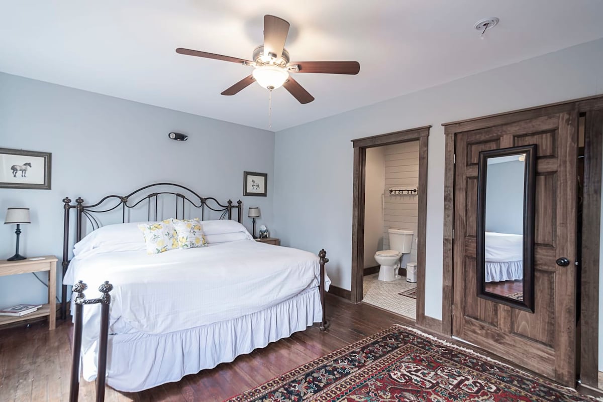 Questa ampia suite ha un letto king size, soffitti alti dieci piedi, vasca idromassaggio e doccia separata. Questa spaziosa suite ti permetterà di avere molto spazio per distenderti e rilassarti. Quando l'edificio fungeva da taverna e locanda a partire dal 1790, questa stanza veniva utilizzata come sezione pubblica per dormire, con otto o più persone che dormivano nella stanza. Si diceva anche che fosse stata usata per ballare. I pavimenti originali in legno di pino sono stati conservati e sono esposti anche numerosi dettagli architettonici.