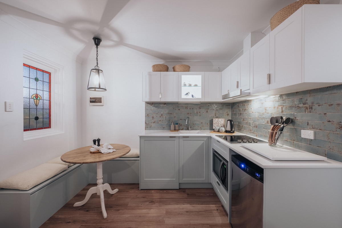Kick back and relax in our calm and stylish space. Perfect for an extended weekend or week away we welcome you to our fully self-contained, one-bedroom cottage, located in sentimental 'old' Quinns Rocks. Private access through the cottage gate in front of your own parking bay. Sink into the sofa, enjoy breakfast in the nook under the dappled light of the stained glass window, wine around the fire pit, and coffee on the verandah. A base to re-energise or re-vitalise your wanderlust.