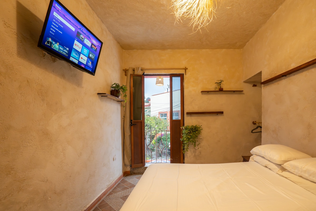 Habitación amplia y acogedora con diseño cálido y estilo natural, ubicada en el corazón del centro de Tepoztlán. Ideal para quienes quieren estar cerca de todo, con acceso caminado a restaurantes, bares, terrazas, cafés, cultura, folkror y la vida del centro. Un espacio cómodo y con buena vibra para descansar después de disfrutar el ambiente del pueblo. Estacionamientos públicos a unos pasos y por la noche en la calle de El Hotelito.