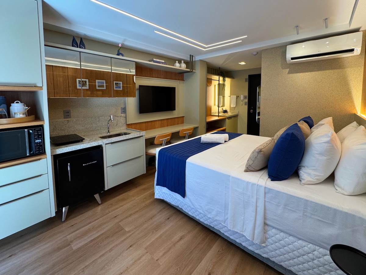 Appartamento sul lungomare a Cabo Branco, di fronte alla spiaggia più famosa di João Pessoa. Sistemati comodamente con un letto queen-size, una smart TV e una cucina dotata di piano cottura a induzione, forno a microonde, macchina per panini e utensili completi. Il condominio offre una piscina con vista sul mare, un centro fitness, una sauna, un portabiciclette, nonché skateboard e kayak a disposizione degli ospiti. L'edificio offre anche la colazione (non inclusa). Posizione privilegiata, ideale per chi cerca svago, stile e praticità.