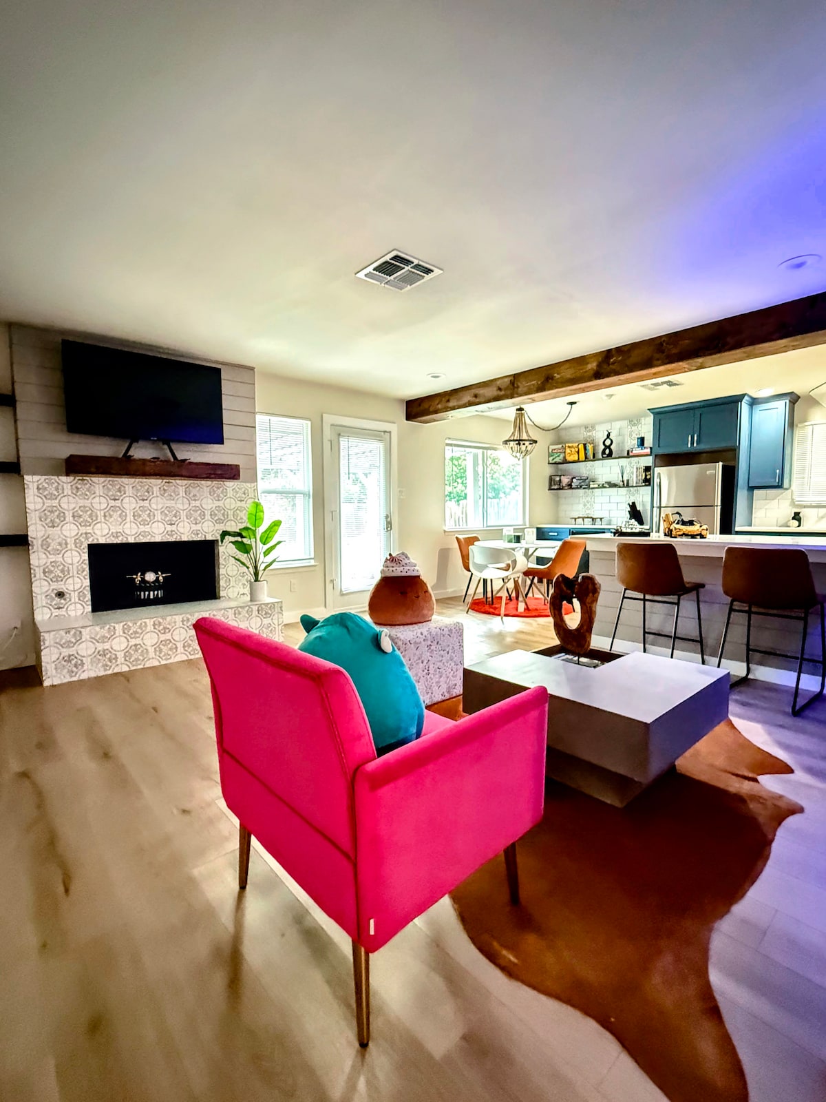 This boho family home is located in a beautiful and peaceful neighborhood where you get the taste of living like a local. Spacious rooms and high ceilings are perfect for family gatherings. With a full kitchen, treat your group to sweet meal, gather around the table with morning coffee, or take a cocktail to the backyard picnic table. You will love the luscious 2.5 bathrooms -snacks -coffee -private back yard -driveway parking -smart tv -propane grill -W/D