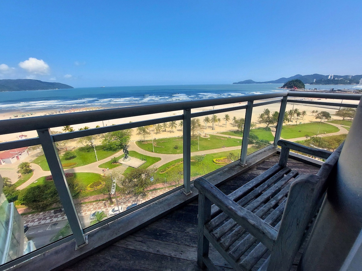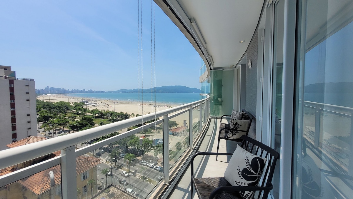 Moderno appartamento con aria condizionata in soggiorno e camera da letto, cucina attrezzata, piano cottura, forno, forno a microonde, Smart TV, Netflix, Wi-fi, e ampio balcone con vista mozzafiato sulla spiaggia di Santos. Il condominio dispone di una completa area ricreativa con due incredibili piscine, una riscaldata e l'altra a sfioro di fronte al mare.