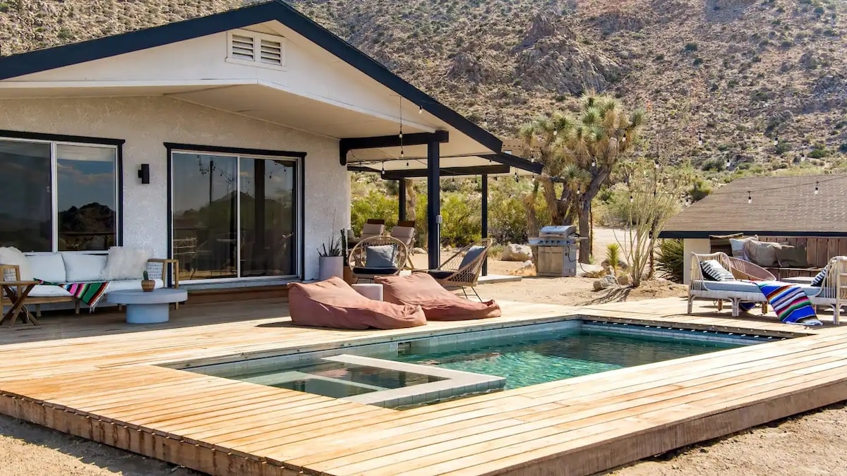 Rifugio nel deserto con piscina, idromassaggio, bracieri, divano letto, sala da pranzo e barbecue ★ "Uno spazio magico che incoraggia la connessione, la riflessione e la presenza."❤️ ✔️Sfera sonora architettonica ✔️ Consigli → Concierge Chef e bagno sonoro (chiedici!) ✔️Cucina completamente attrezzata e rifornita Filtro dell'acqua a✔️ osmosi inversa ✔️Parcheggio → vialetto (4 auto) ✔️50 Mbps wifi + spazio di lavoro ✔️Doccia esterna + vasca + fuoco 3 minuti all'ingresso del Parco nazionale del → Joshua Tree 10 minuti → Centro di Joshua Tree