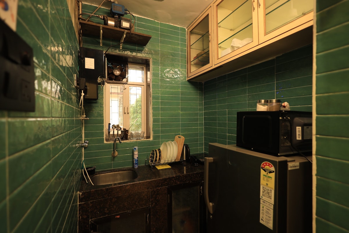 Grazie alla posizione centrale di questo alloggio, l'intero gruppo potrà accedervi facilmente. È un appartamento con 2 camere da letto completamente arredato, un soggiorno e una cucina completamente funzionale. È vicino alla spiaggia di Juhu, ai mercati di Santacruz e Irla. Ci sono AC in tutte le camere da letto e il soggiorno. La cucina è completamente attrezzata. Amiamo servire i nostri ospiti al massimo livello di comfort. La pulizia giornaliera viene effettuata dal custode. Nel soggiorno è presente un divano letto full size per 2 adulti.