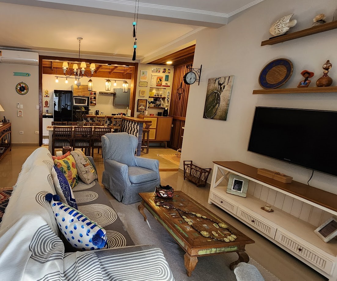 Spazio familiare di 80 m2 stile Townhouse/appartamento al 1° piano, arredato/attrezzato in condominio (Brisas de Juquehy Resort: Av Mãe Bernarda n. 2298, appartamento 63) portineria 24 ore, accesso a scala 15 gradini con nastro antiscivolo e corrimano. Soggiorno: TV con canali Sky, aria condizionata, cucina completa con lavastoviglie e fornello a gas, 3 suite con aria condizionata/asciugacapelli, tutte le suite hanno TV con canali Sky, 1 suite con ferro da stiro e culla portatile. Balcone: birreria e barbecue, frigorifero disponibile in casa.