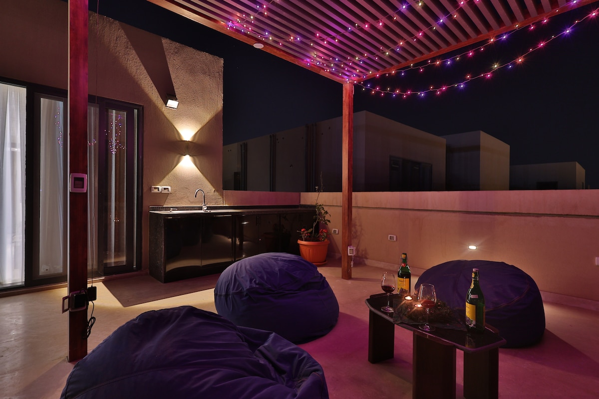 Moderno attico completamente arredato a VYE SODIC New Zayed. Una camera da letto, soggiorno con divano letto, cucina attrezzata. Terrazze private anteriori e posteriori con bar all'aperto, illuminazione intelligente a pergola, impianto audio e barbecue. Wi-Fi veloce, 2 smart TV, aria condizionata completa, spazio di lavoro. Ascensore, parcheggio, verde nei dintorni. A pochi minuti dall'aeroporto della Sfinge e dal Grande Museo Egizio.